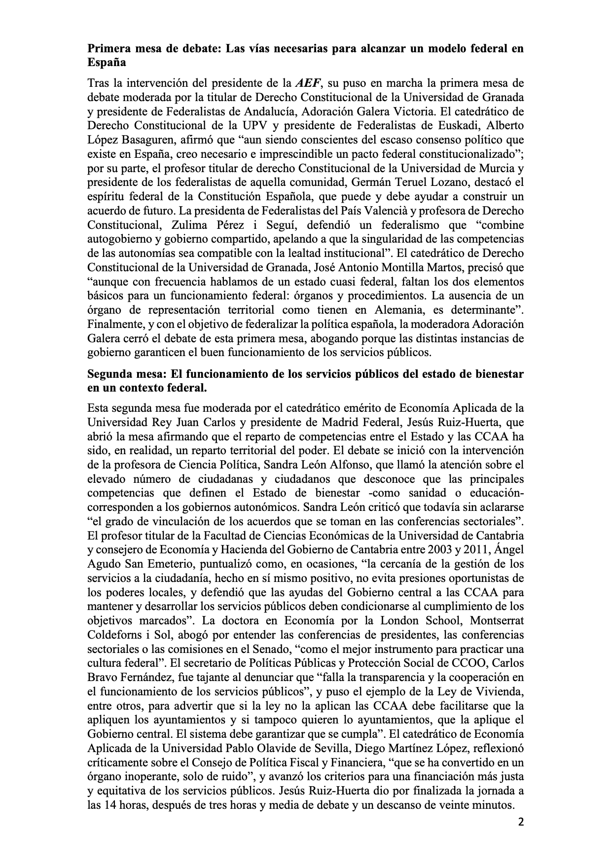 En su conferencia, que inició planteando la necesidad de contrarrestar las deformadas presentaciones de nuestra tradición federalista, Ramón Maiz desgranó los elementos básicos del federalismo, destacando su contraste con los nacionalismos -el concepto no nacionalista de nación-, la noción de gobierno compartido, de conformación de una voluntad común, su aplicabilidad a los distintos niveles de la vida política. No dejó de señalar la importancia de la cultura política federal y de sus valores y actitudes cívicas favorecedoras de un clima que posibilita la superación de conflictos mediante la producción de confianza y la constante búsqueda de acuerdos.